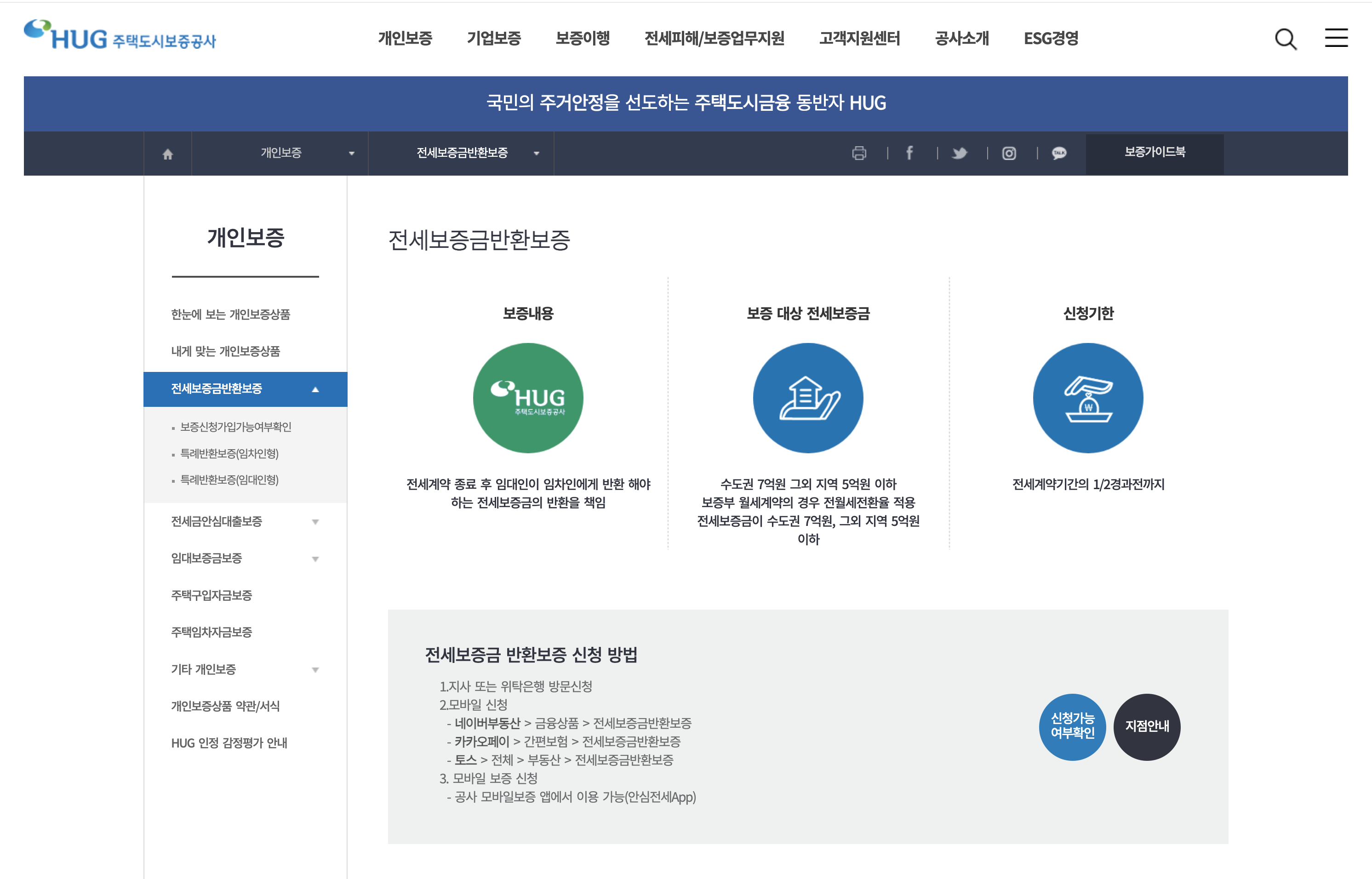 - 주택도시보증공사(HUG) : 수도권은 최대 7억 원, 그 외 지역은 최대 5억 원까지 보증해 줍니다. 단독, 다가구, 연립주택, 아파트, 주거용 오피스텔, 노인복지주택 등이 보증 대상이에요.