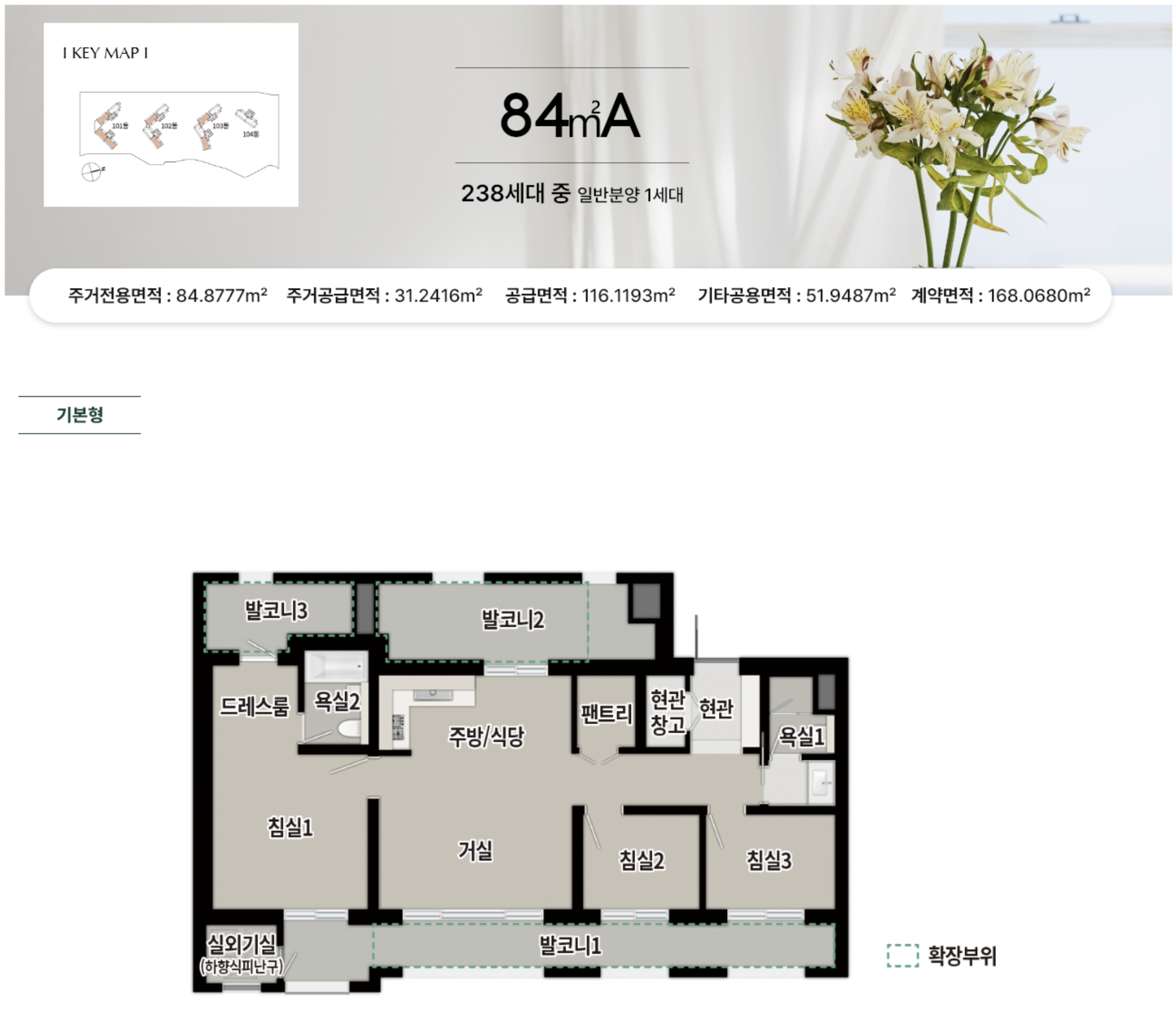 전용면적은 74㎡, 84㎡ 두 가지로 구성되어 있으며, 세대수는 다음과 같습니다.