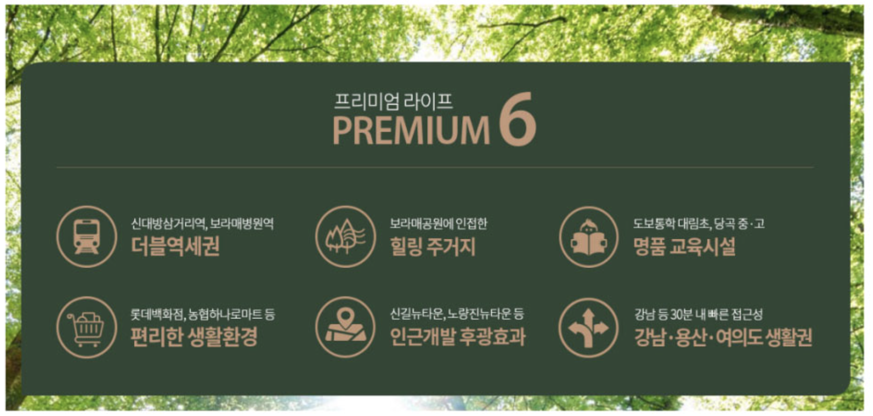 인근에는 대형마트·병원·공원·학교가 조밀하게 분포하고, 특히 보라매공원 도보 생활권이라는 점은 소형 신축 주거에서 드문 장점으로 평가됩니다.