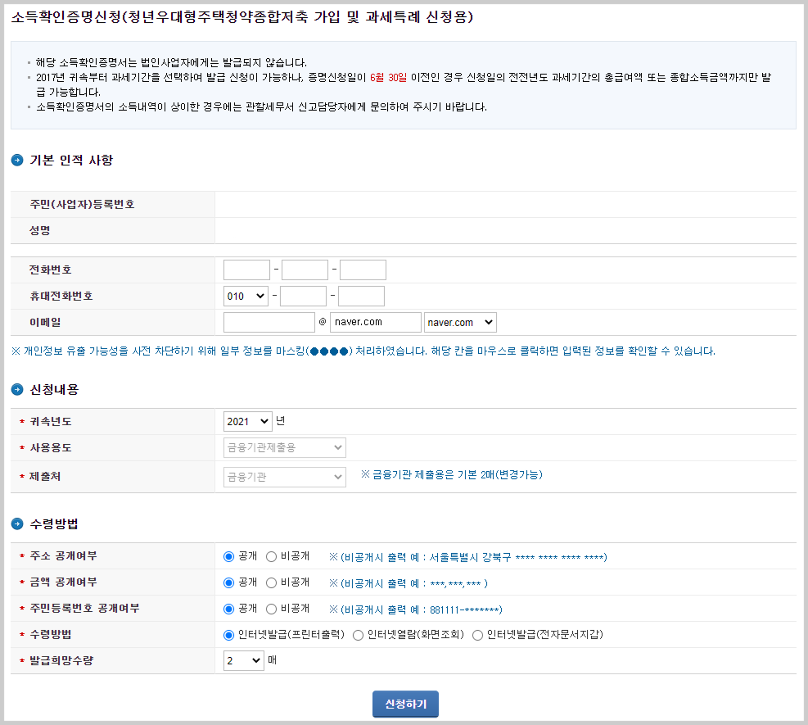 (청년우대형주택청약 종합저축 가입 및 과세특례 신청용)