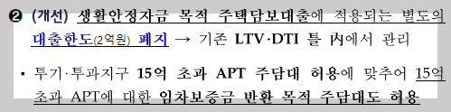 보유주택 담보대출: 생활안전자금 목적 주택담보대출에 적용되는 별도의 대출한도(2억원)을 폐지하고 기존 LTV, DTI 범위 안에서 관리하기로 하였다. 투기지역, 투기과열지구 내의 15억 초과 APT 주담대 허용에 맞추어 15억 초과 APT에 대한 임차보증금 반환 목적 주택담보대출도 허영한다.