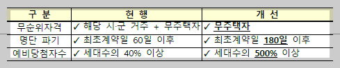 실생활 애로 해소: 무순위 청약 관련하여 청약 지역 내 거주자에게만 무순위 청약이 이뤄졌던 것이 거주지역 요건을 폐지하여 청약 대상자를 확대시켰다.