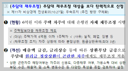 주택담보대출 채무조정: 매출액이 급감, 금리상승 등에 따른 상환부담 급증으로 주담대 원리금 정상상환이 곤란한 차주에게도 채무조정을 적용시키기로 했다.
