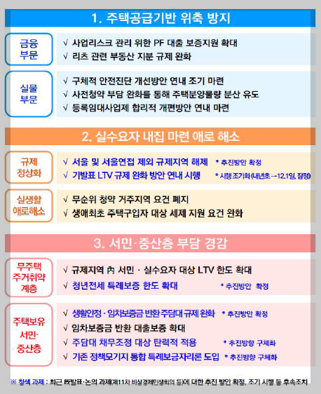 규제정상화: 규제지역 내 주택 가액별로 차등화되어 있는 무주택 LTV 규제를 50%로 일원화하였으며 투기과열지구 15억 초과 아파트에 대한 주담대 금지 규제도 해제되었다. 10월 27일에 발표되어 내년 초에 시행하기로 했던 이 정책은 12월 1일로 조기 시행하기로 잠정 결정되었다.