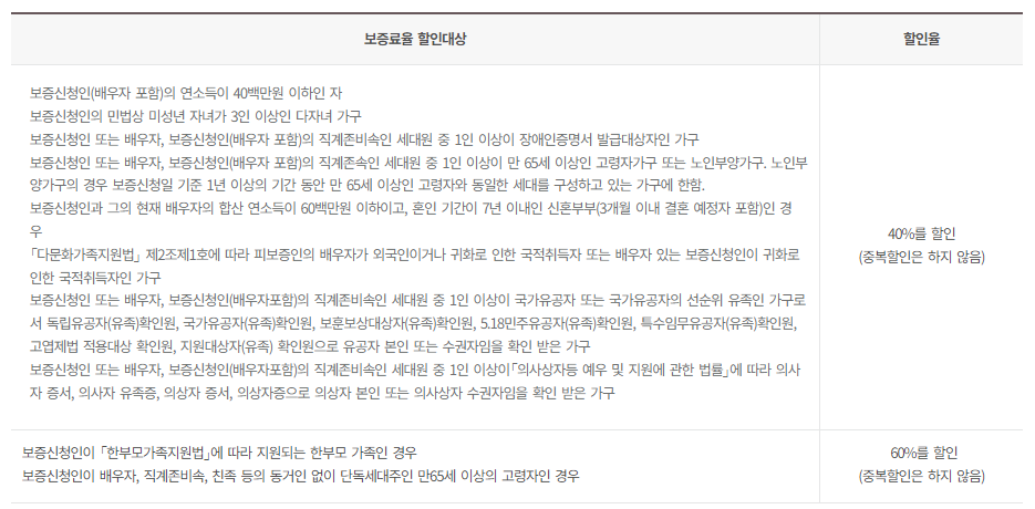 보증 상품에 따른 보증료가 발생을 하는데, 보증료는 보증금액 X 보증료율 X 보증기간에 해당하는 일수/365로 계산되며 보증료율은 연 0.130%로 고정요율이다. 국가에서 취급하는 상품으로써 큰 폭의 할인이 적용될 수 있는데, 미성년자녀가 3인 이상인 다자녀 가구, 보증신청인 또는 배우자, 보증신청인의 직계존비속인 세대원 중 1인 이상이 장애인 증명서 발급대상인 가구 등 40% ~ 60%의 할인이 가능하나 중복할인은 불가한 점 참고바란다.