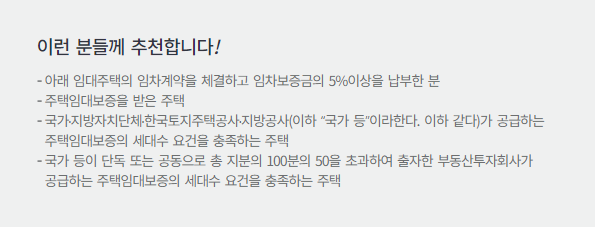 주택임차자금보증 이런 분들께 추천합니다! 아래 임대주택의 임차계약을 체결하고 임차보증금의 5%이상을 납부한 분 주택임대보증을 받은 주택 국가·지방자치단체·한국토지주택공사·지방공