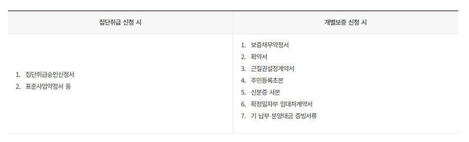 보증 신청을 위해 필요한 제출서류는 집단취급의 경우 1. 집단취급승인신청서, 2.표준사업약정서 등 일반적으로 2 가지 서류만 제출하면 되나 개별적으로 보증을 신청할 경우, 1. 보증채무약정서, 2. 확약서, 3.근질권설정계약서 등 7가지의 서류를 필요로 한다. 임대주택에서 어떠한 형태로 진행하느냐에 따라서 흐름을 따라가면 되겠다.