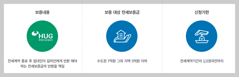 주택도시보증공사에서 보증하는 내용은 전세 계약에 대해서 계약일 도래 후 임대인이 임차인에게 반환해야 하는 전세보증금의 반환을 책임지는 내용이다. 보증 대상 전세보증금은 수도권의 경우 7억원, 그 외의 지역은 5억 원 이하만 대상이 된다. 반환보증 신청은 전세계약서 상 잔금지급일과 전입신고일 중 늦은 날로부터 전세계약기간의 1/2 경과하기 전까지 가능하고 갱신을 할 경우에도 역시 1/2 경과하기 전까지 가능하다. 보통 잔금지급을 하고 입주한 다음에 전입신고를 하는 절차이기 때문에 전입신고를 하고 난 다음에 신청이 가능하다고 이해하면 되겠다.
