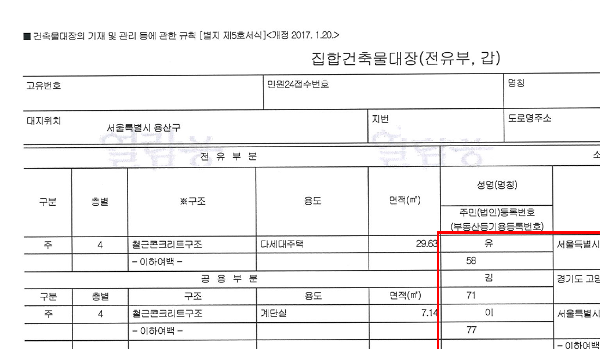 소유자는 해당 호수를 실질적으로 소유하고 있는 소유자의 현황에 대해 나와있다. 준비한 자료는 해당 세대를 3명이서 나눠서 소유하고 있다. 따라서 부동산 계약을 할 때도 이 3명과 모두 계약서를 작성해야한다.