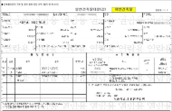 건축물대장의 이름표 오른쪽에 노란색으로 잘 안보일 수 없게 위반건축물이라는 딱지를 붙여놓았다. 그리고 다음장의 '변동사항'란을 참고하면 위반건축물이 지정된 이유에 대해서 알 수 있다. (위반건축물 변동사항에 대한 자료를 확보하지 않아서 추후 다른 사진으로 설명을 대체하도록 하겠다.)