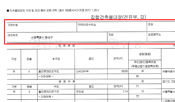 아마도 가장 많은 빌라를 사는 사람들이 가장 많이 볼 수 있는 형태가 집합건축물대장일 것이다. 전유부는 말그대로 전유하고 있는 부분에 대한 내용을 표기한다. 가장 위에는 건축물의 명칭(000캐슬), 호수, 위치, 지번 및 도로명 주소에 대해서 표기가 된다.