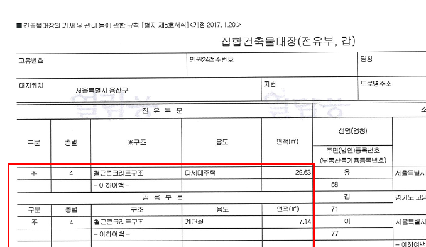 면적정보에는 위에 건축물 정보에 표기되어 있는 호수의 면적에 대해 나와 있다. 면적은 전유부분과 공용부분으로 나뉘어지는 데, 전유부분은 현관문 열고 들어간 뒤에 나 혼자 사용하는 부분을 말하고, 공용부분은 말그대로 공용으로 지분을 갖는 지역을 말한다. 전유부분을 전용면적이라고 하며, 전유부분과 공용부분을 더한 면적을 계약면적이라고 한다.